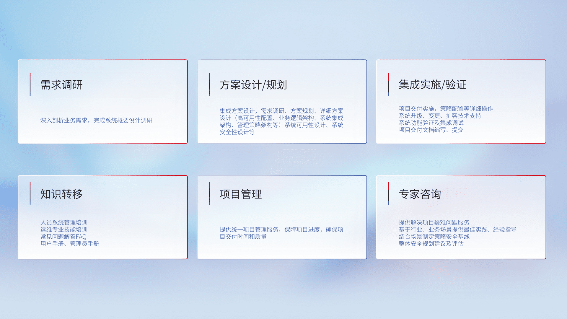 针对客户行业特性,,,将宏观的安全战略和需求,,通过专业的交付服务,,,,实现项目落地,,,,为客户提供标准规范的集成交付服务。。。。
